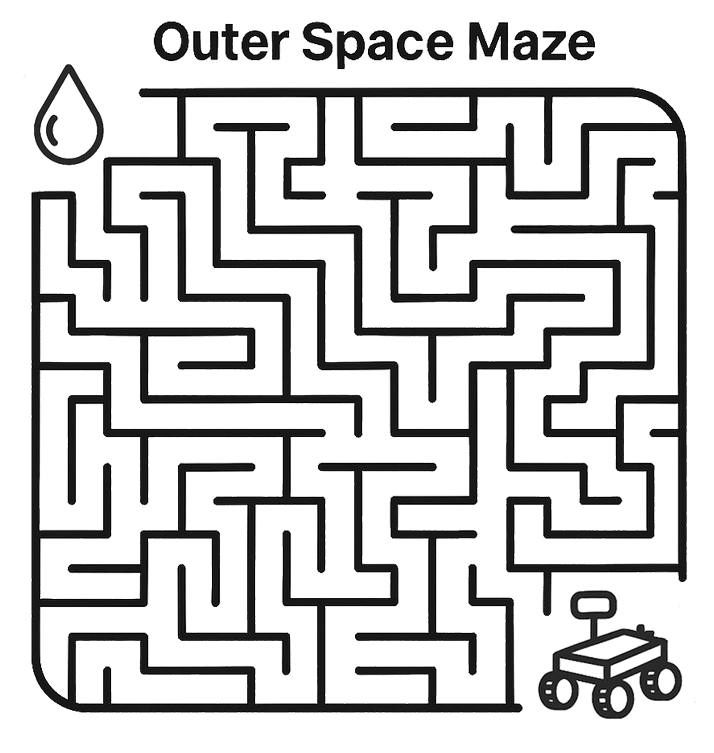 Outer space maze puzzle from Cosmic Adventurer book – fun activity for children exploring space themes like planets and rovers.