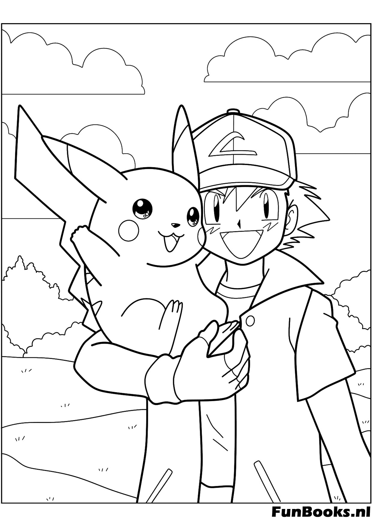 Sacha serrant son meilleur ami Pikachu dans ses bras scène anime coloriage