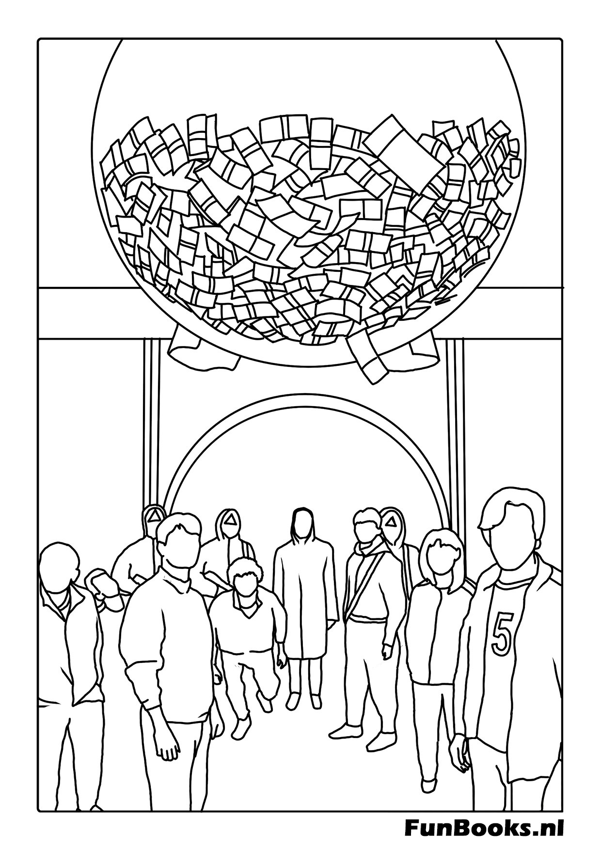 La tirelire géante en verre remplie d'argent liquide suspendue au-dessus des joueurs dans le dortoir Squid Game coloriage