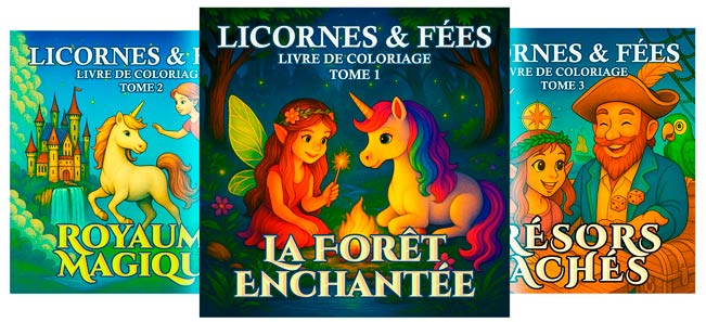 Livre de coloriage fantastique basé sur une histoire pour enfants, avec des licornes, des fées et des aventures en forêt enchantée.
